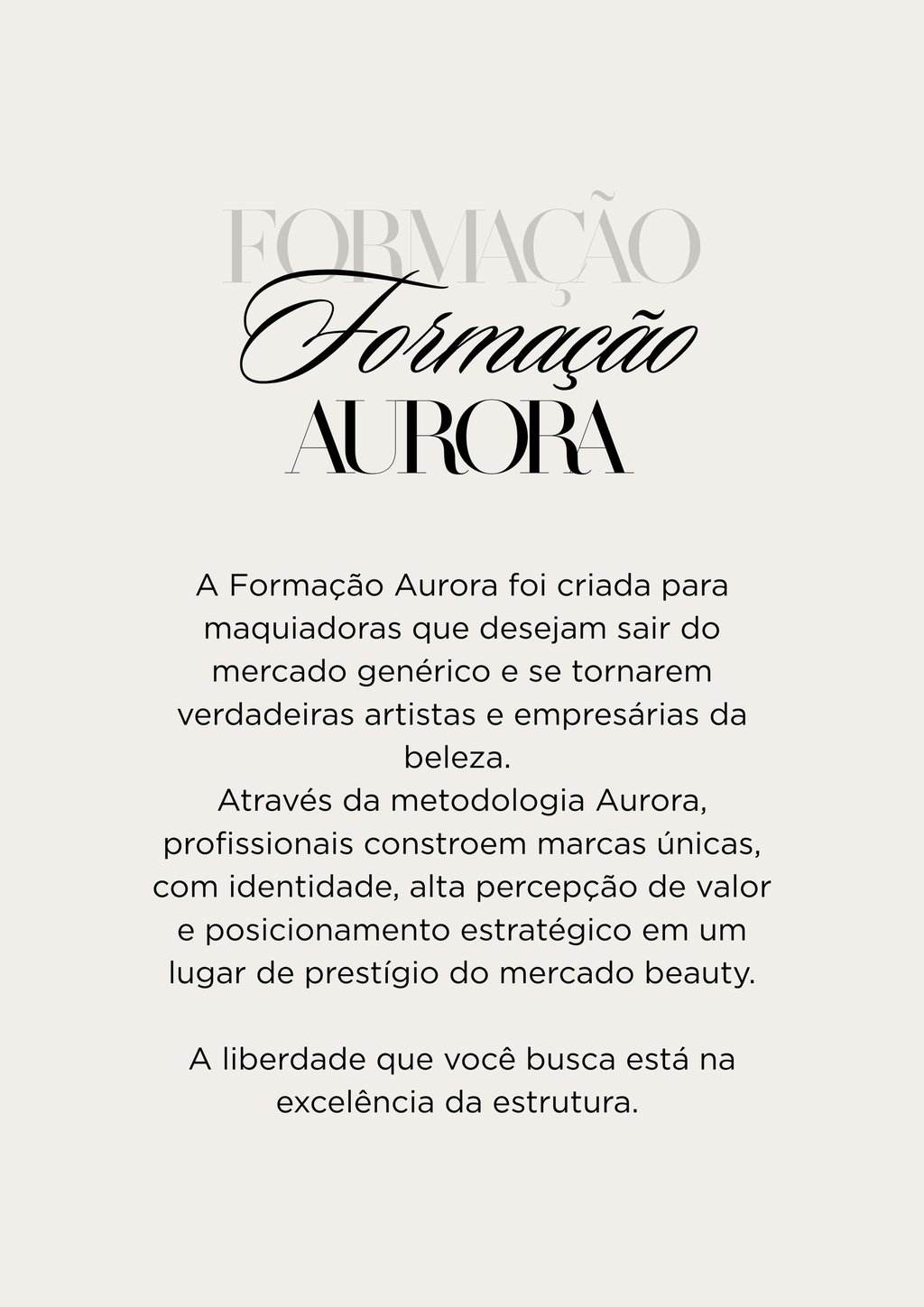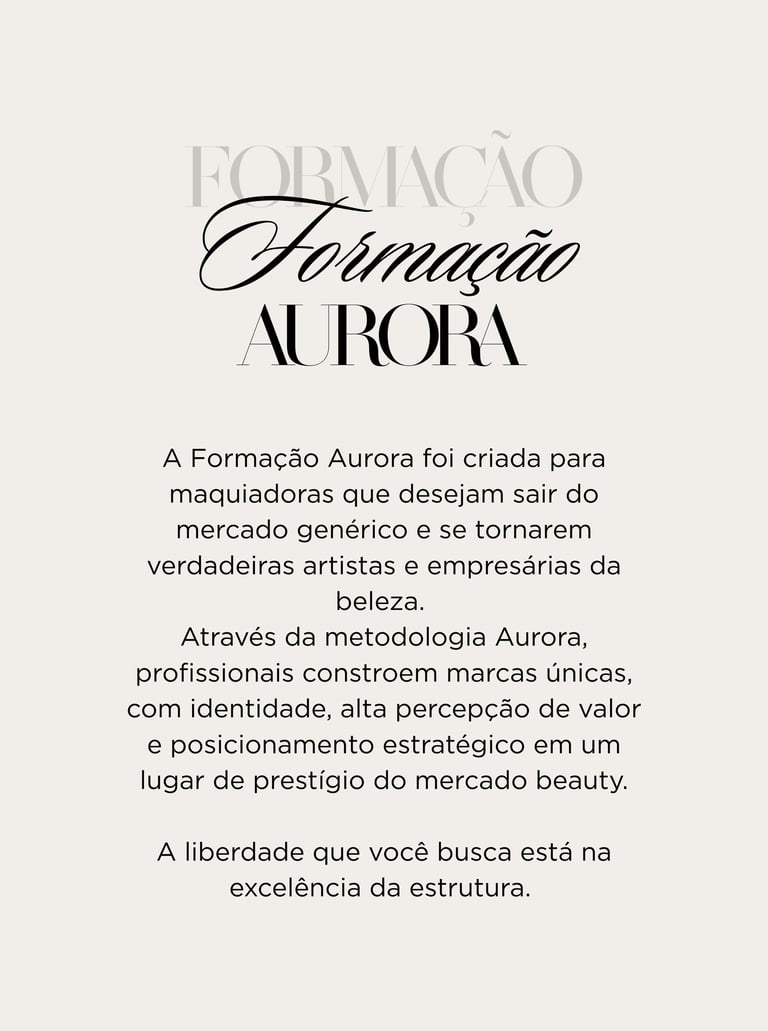 Na Aurora Académie, acreditamos que toda maquiadora pode ser valorizada como uma artista. Nossa missão é te guiar na construção de uma marca única, que carrega essência com sofisticação e autoridade.